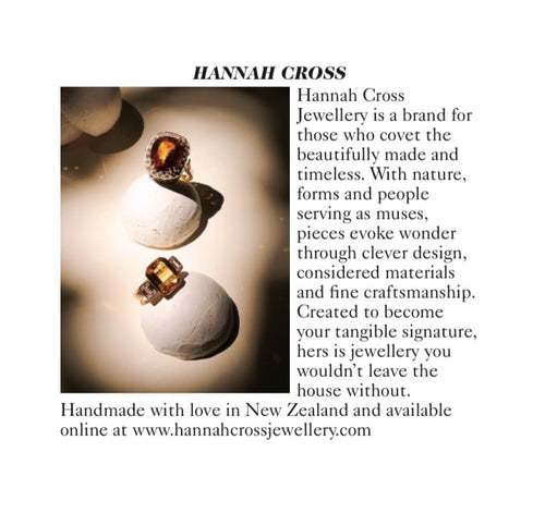 To Hannah Cross Jewellery, Lovingly handmade in New Zealand. Offering ready-to-wear, made-to-order and bespoke pieces with a focus of quality materials and fine craftsmanship. Please get in touch if you want to discuss a bespoke creation.