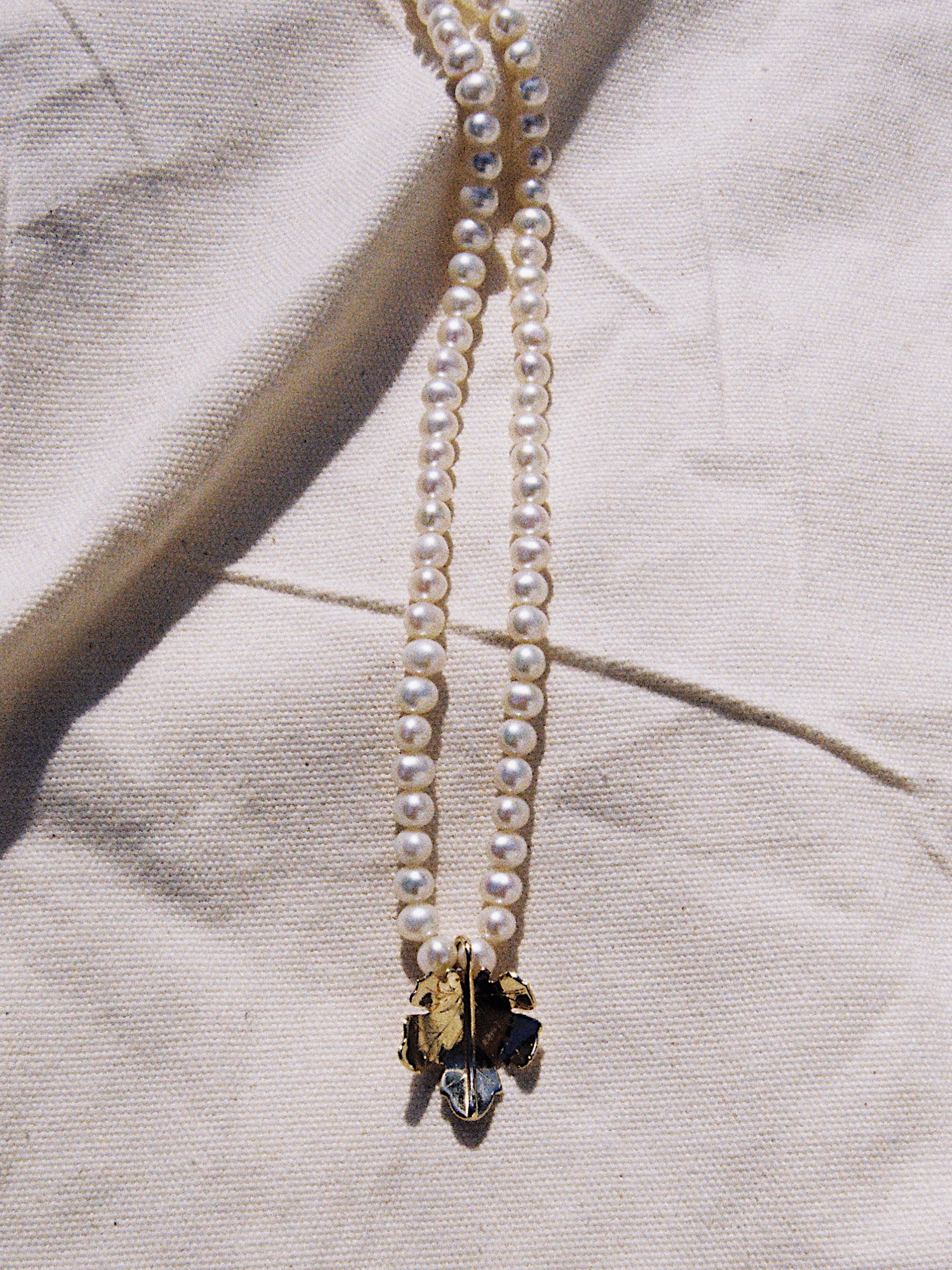 Sterling silver or 9ct Yellow gold necklace enhancer inspired by a fig leaf, on a fresh water pearl necklace with a handmade clasp in matching metal.