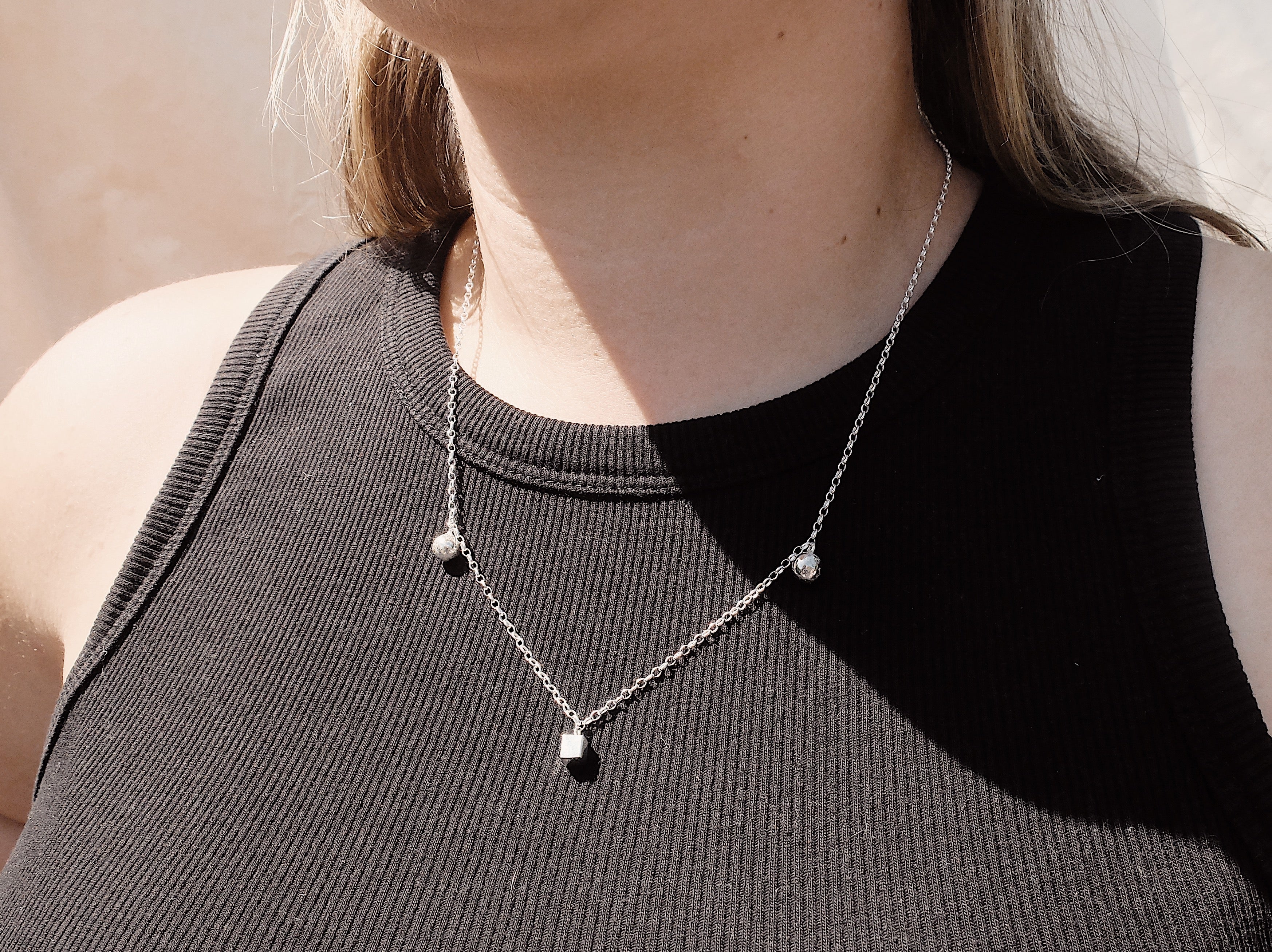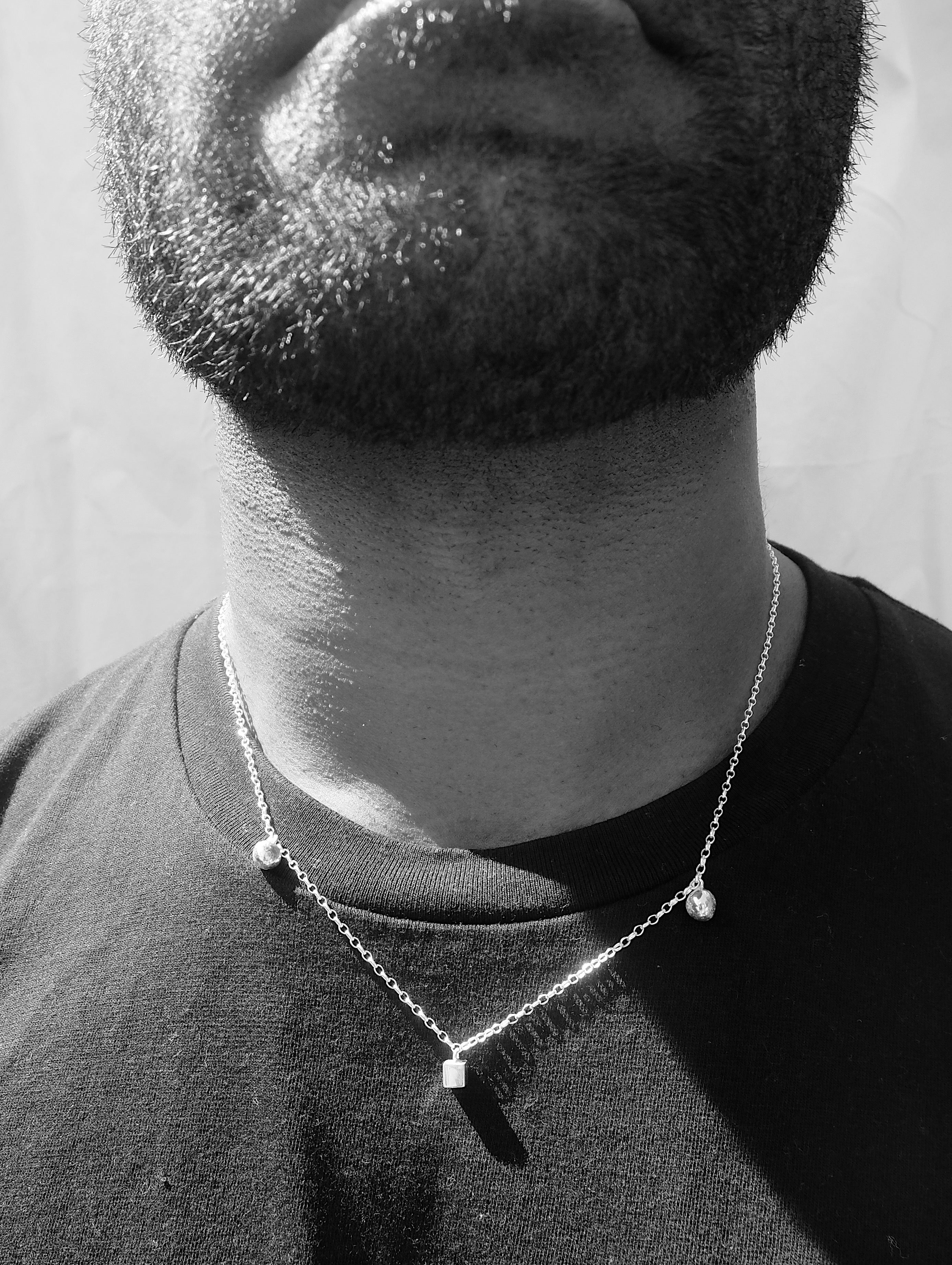 Sterling silver necklace with handmade cube and spheres on a manufactured oval belcher link chain. Length of chain - 55cm