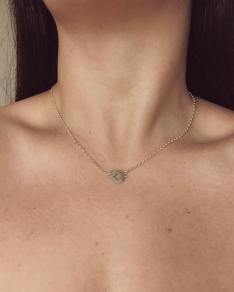 Handcrafted Sterling silver New Moon symbol soldered into a fine manufactured sterling silver belcher link chain.